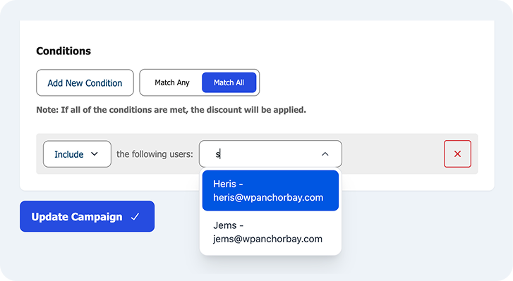 Go beyond basic sales. Target multiple user roles or individual customers by User ID to ensure the right person gets the right offer.