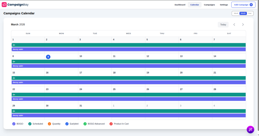 In short, CampaignBay includes a dedicated Analytics Dashboard and additionally, a Campaign Calendar. It doesn’t just apply discounts; it tracks them. Furthermore, you can see line charts of “Sales from Campaigns” vs. “Total Discounts Given,” helping you measure your actual ROI in real-time.