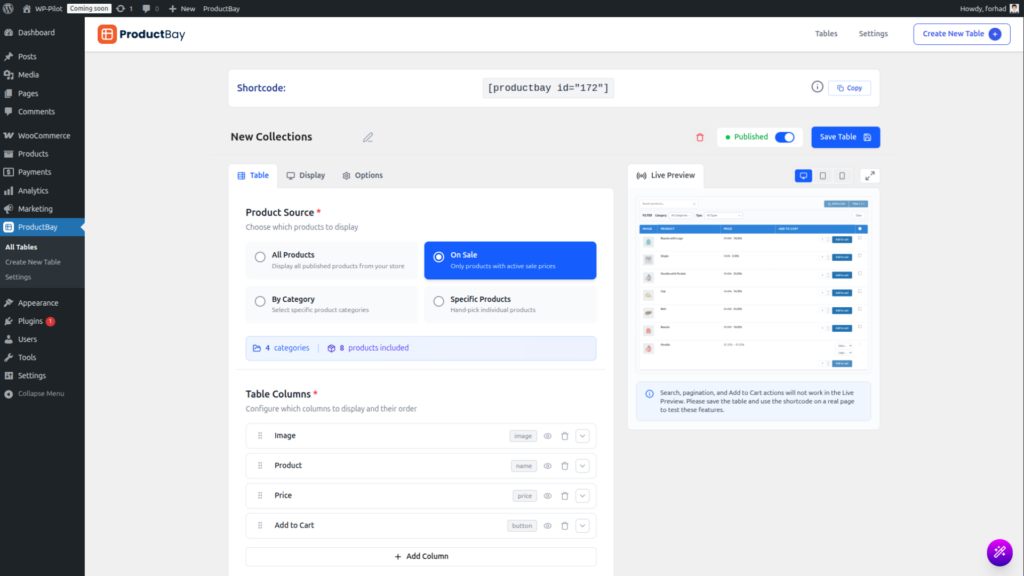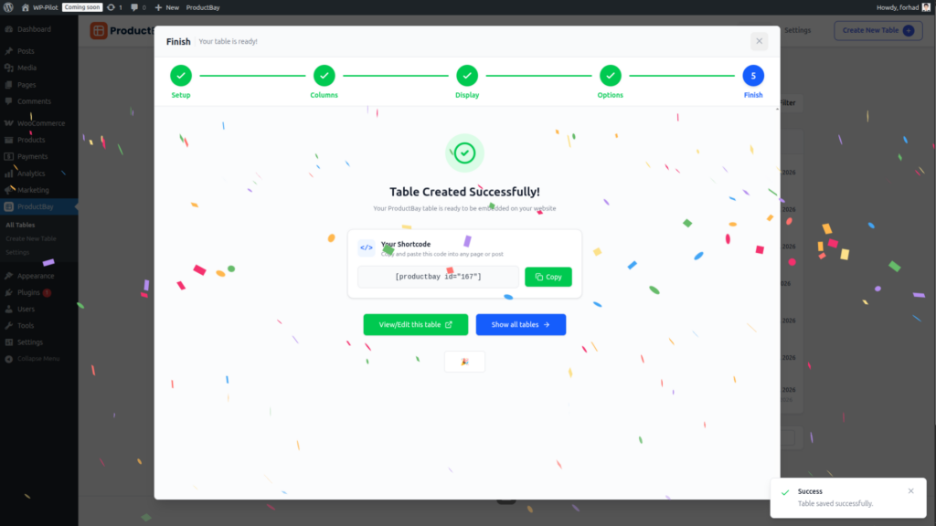 Getting a WooCommerce product table live should not require technical expertise. ProductBay’s five-step Creation Wizard guides administrators through the full setup process: naming the table, selecting a product source, configuring columns, customizing the design, and generating a shortcode.