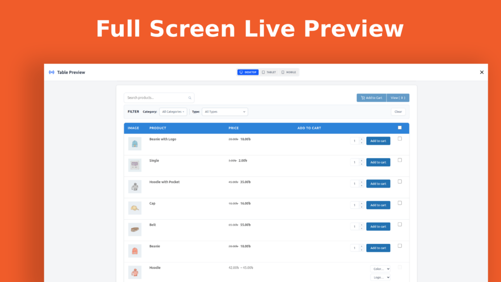 • Quick View: An AJAX-powered product modal triggered directly from the table